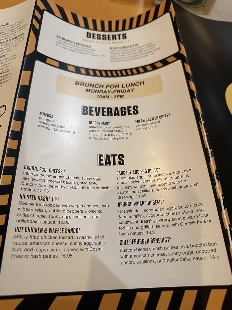 crisp home fries, diced bacon, smoked maple drizzle, scrambled eggs, cheddar cheese, sour cream, & green onions. wrapped up in a soft flour tortilla and grilled to perfection. served with a side of Cosmik-seasoned home fries or Cosmik Fries.